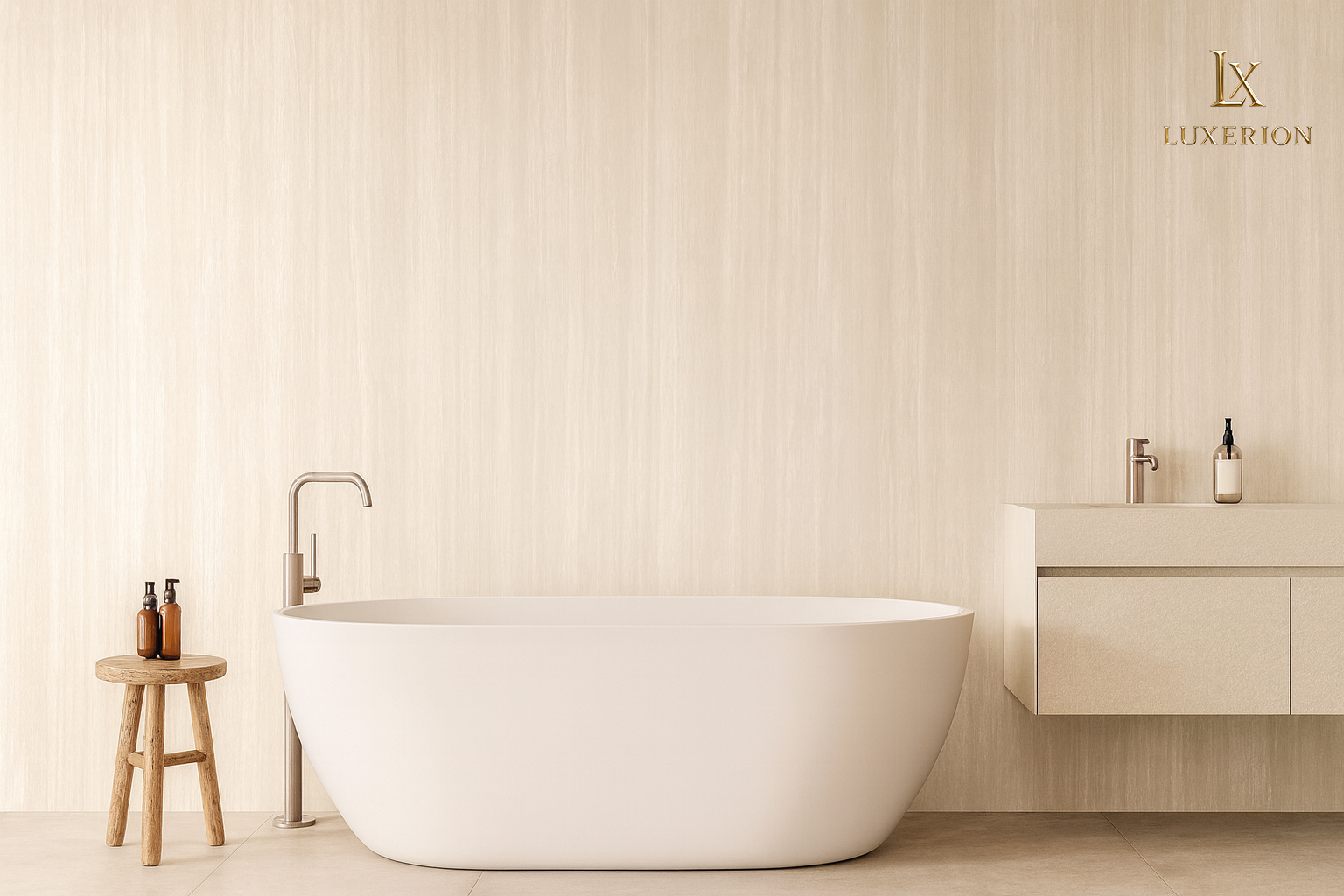 De Koolstofpanelen in de kleur TRAWERTYN hebben een extra eigenschap – een oneindige continuïteit van het patroon! Door panelen naast elkaar te plaatsen creëer je het effect van een eindeloos stenen oppervlak.