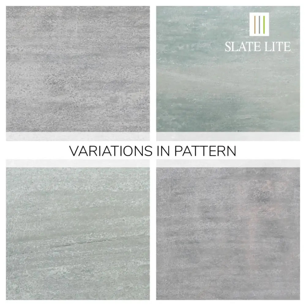 Kleurverschillen tussen individuele platen, kwartslijnen, natuurlijke barstjes of kleine afsplinteringen kunnen voorkomen. Dit is geen fout, maar juist een kenmerk van het echte natuursteenoppervlak en maakt elke Slate-Lite plaat uniek